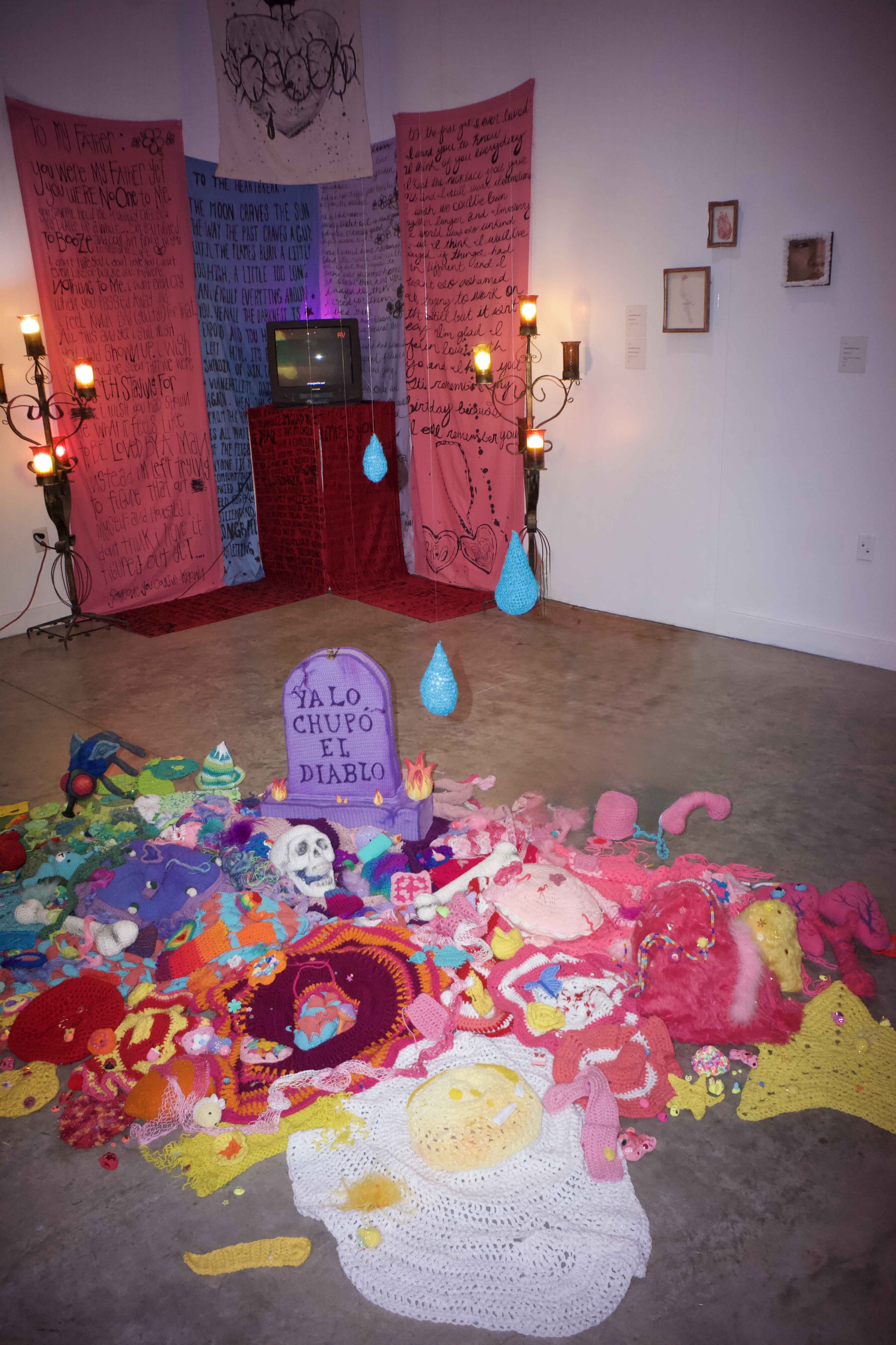 Crocheted yarn, air dry clay, rhinestones, toys, pipe cleaners, stickers, pursued and found objects, one pinned butterfly, cigarettes